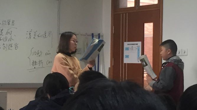 执教九年级的马颖老师上的是复习课《记承天寺夜游》,在复习的过程中,老师用各种方式调动学生对课文的记忆,通过各项活动让每个学生都积极参与到复习中,同时,又联系柳宗元的《小石潭记》与之对比,联系《江城子·密州出猎》引导学生深入体会作者的情感,再和陶弘景的《答谢中书书》进行比较,让复习课成为一个温故知新,梳理贯通的生动的学习环节。刘洁老师在六年级的课堂上上《在柏林》这篇小说,小说虽然很短,但老师从学生预习时的质疑出发,以小说三要素为线索,向学生展示了阅读小说的路径。更可贵的是,老师引导学生关注一些看似多余的人物,看似多余的笔墨来品味小说的语言,形成非常好的学习氛围也达到了很好的效果。