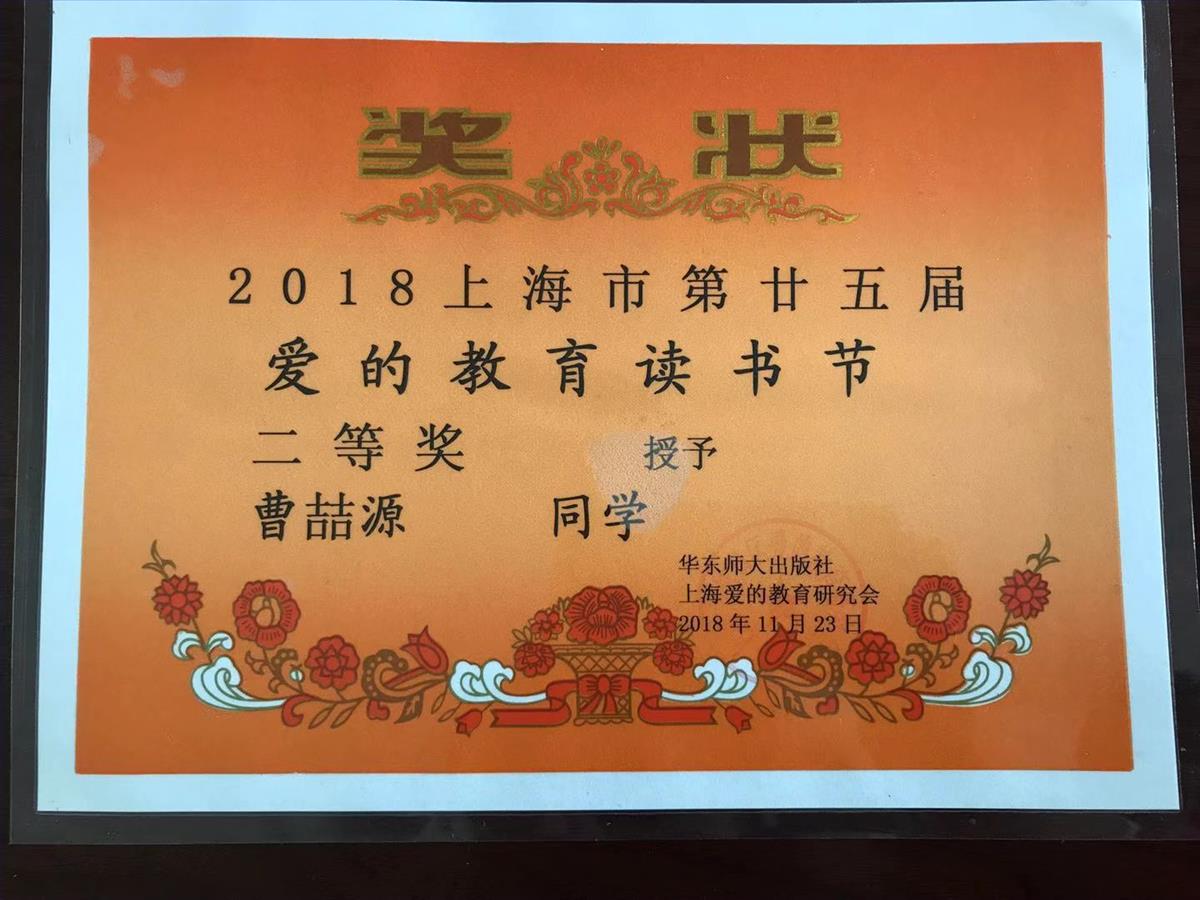 在华师大出版社和上海爱的教育研究会主办的“2018年上海市第二十五届爱的教育读书节”活动中,我校同学获得佳绩,获奖名单如下:
