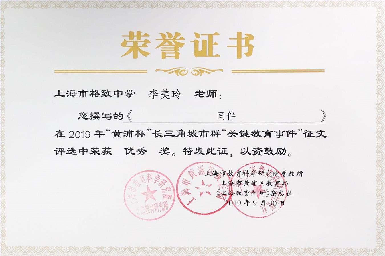 另在2019年“黄浦杯”长三角城市群“关键教育事件”征文评选中,我校政治教研组李美玲老师的文章《同伴》荣获 优秀奖。
